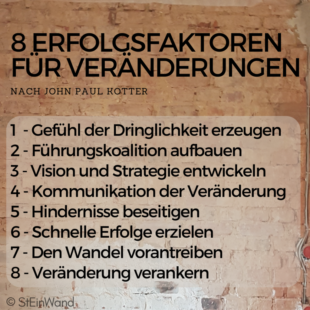 Ich krame in meiner Berater-Werkzeugkiste und entdecke „Change Management„. Sie werden hierzu zahlreiche Definitionen finden. Meine vereinfachte Erklärung lautet: Change Management (zu deutsch: Veränderungsmanagement) umfasst gezielte Maßnahmen eines Unternehmens, um Veränderungen erfolgreich zu gestalten. Dazu gibt es verschiedene Ansätze. Ich selbst habe in meiner beruflichen Vergangenheit insbesondere mit Kotters 8 Erfolgsfaktoren für Veränderungen gearbeitet. Eine Alternative ist das 3-Phasen Modell von Lewin. StEinWand soll pragmatisch sein und auf die Umsetzung fokussieren. Daher bleibe ich einfach bei Kotters Modell und wähle es als Grundlage für meine Struktur.